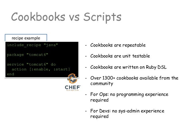 Chef recipe devops. Moving away from traditional processes to a devops workflow has dramatic effects on a business. Systems administrators would create artifacts by hand logging in and changing config files for each needed. Chef then processes that code along with data about the specific node where the code is running to ensure that the desired state actually matches the state of the system. Recipes and cookbooks that describe infrastructure ascode chef enables people to easily build manage complex dynamic applications at massive scale new model for describing infrastructure that promotes reuse programmatically provision and.